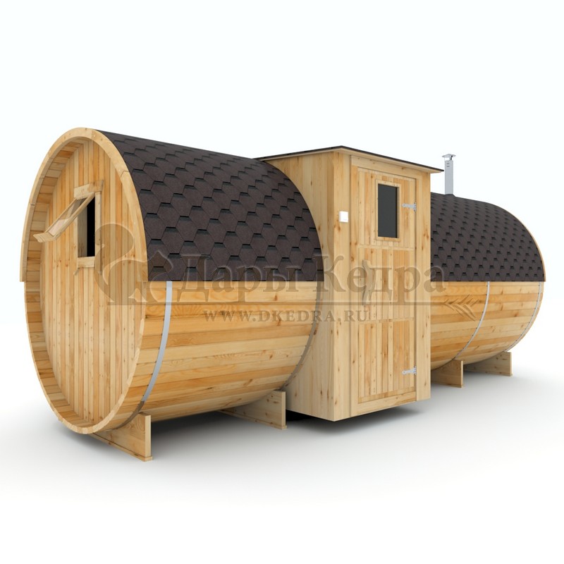 Баня-бочка буханка из кедра с верандой (все размеры) Баня-буханка более просторная за счет увеличенной высоты потолков и ровного пола. На веранде можно оставить вещи или отдохнуть после процедур парения. Лавочки из кедра находятся по всей длине бани-бочки с обеих сторон. Печь расположена в парилке около дальней стены. Время растопки такой бани не превышает 30 минут. В зависимости от выбранного размера баня-бочка буханка с верандой имеет следующую комплектацию: Баня-бочка буханка 2,5 метра - парилка; Баня-бочка буханка 3,5 и 4,5 метра - раздевалка, парилка; Баня-бочка буханка 5,5 метров - раздевалка, парилка, моечная. По вашему желанию ее можно укомплектовать печью с внешней загрузкой, благодаря которой весь мусор вовремя топки остается на улице. Баня-бочка буханка не требует полноценный фундамент, поэтому при необходимости ее можно перенести в другое место. Обращаем Ваше внимание, что в стандартную комплектацию бани входят полки открытого типа в парной с обеих сторон. Дополнительно можно заказать полок закрытого типа или лавку! Кедр обладает ароматическими свойствами. Он не деформируется и влагоустойчив, при правильном уходе за деревом на нем не развиваются грибки и плесень.