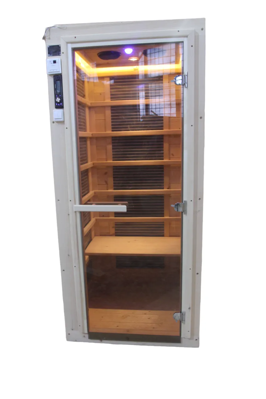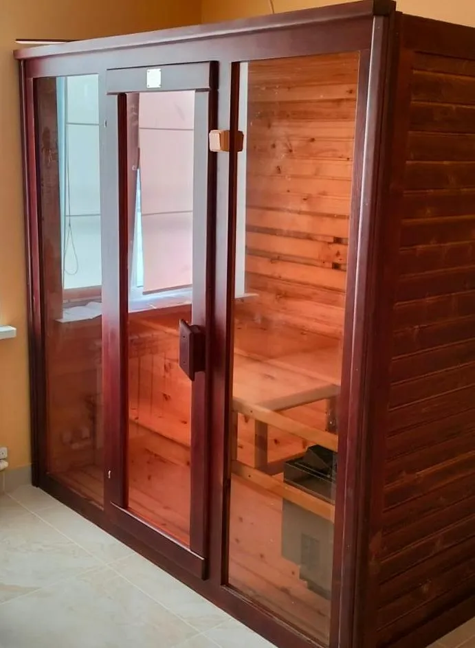 Это специально оборудованная деревянная кабина для сухого и влажного парения. Электропечь нагревает пространство внутри и позволяет сбрызгивать камни водой, слегка увлажняя воздух. Такая процедура позволяет избежать перегрева. Двойные стенки кабины с теплоизоляционным материалом удерживают тепло. Установка сауны в угол позволяет рационально использовать пространство помещения. Финская сауна с электропечью подойдет, как для домашнего использования, так и для коммерции. Доставляется в разборном виде щитами, собирается по инструкции с помощью шуруповёрта.